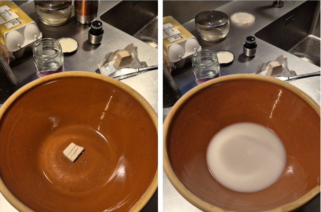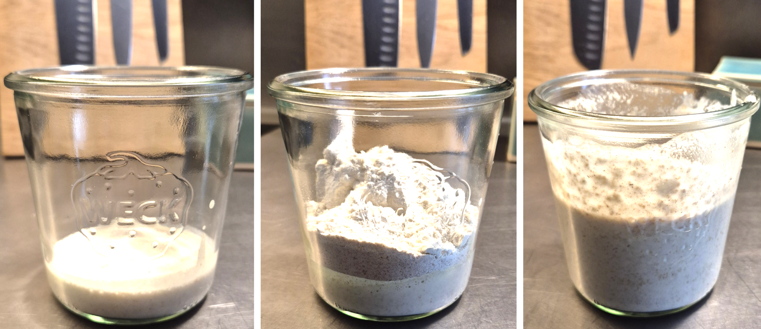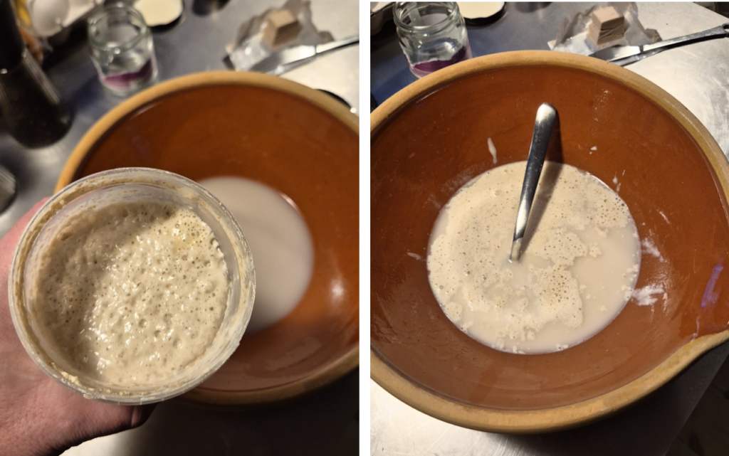 Bland det, så alle klumper udjævnes. Lad den hygge sig ved stuetemperatur i 8-24 timer under løst låg (eller prik 3-4 små huller med en stoppenål). I den periode er surdejen ung, frisk og lækker. Vildtgæren og mælkesyrebakterierne er helt optimale, hvorfor vi kan holde gærmængden lav.