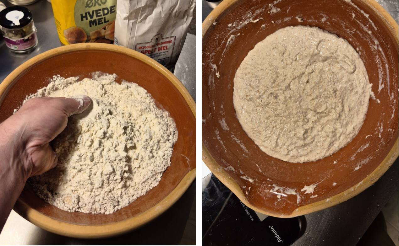 Lad dejen hvile i ca. 45 minutter. Denne proces kaldes autolyse, hvilket betyder, at stivelsen i melet og glutenstrengene langsomt opsuger væsken, og gør sig klar til at blive æltet nænsomt.