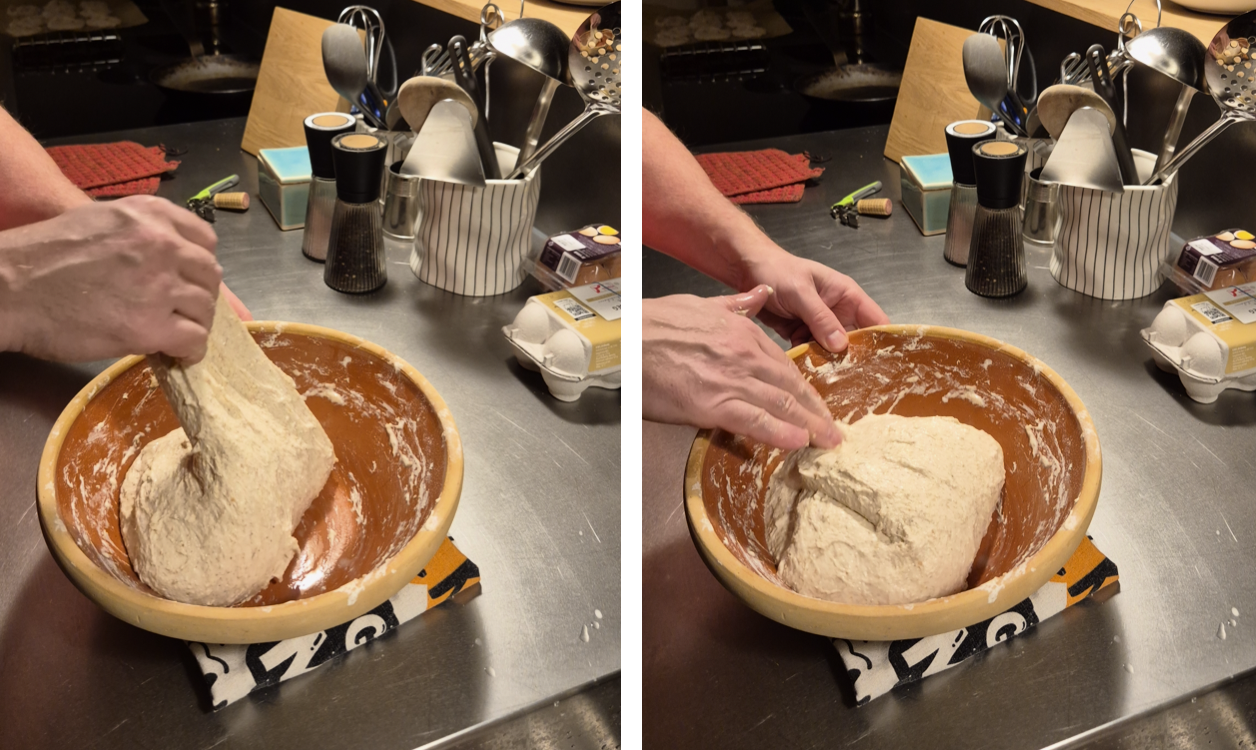 Sæt en lille skål med koldt vand ved siden af skålen. Dyp hånden i vandet, og tag fat i et hjørne af dejen. Kom helt ned til bunden og træk den forsigtigt op og hen mod det modsatte hjørne. Drej skålen en kvart omgang og gentag øvelsen. Dette gør du fire gange, til du er tilbage ved udgangspunktet. Lad skålen stå ved stuetemperatur.