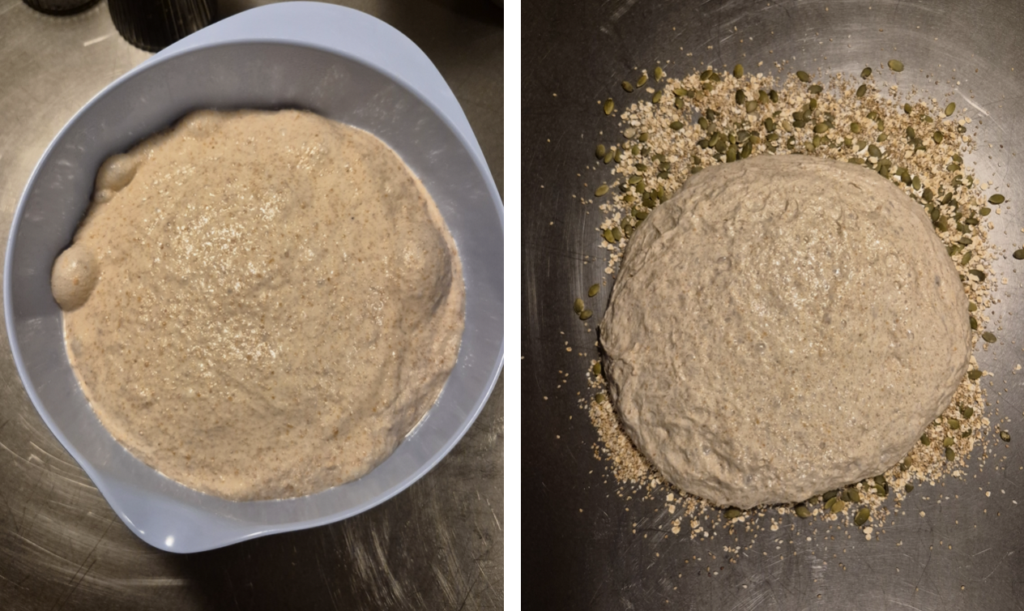 Drys bordet med mel, havregryn, kerner eller en blanding, så det dækker ca. 40 x 40 cm og hæld forsigtigt dejen ud på bordet.