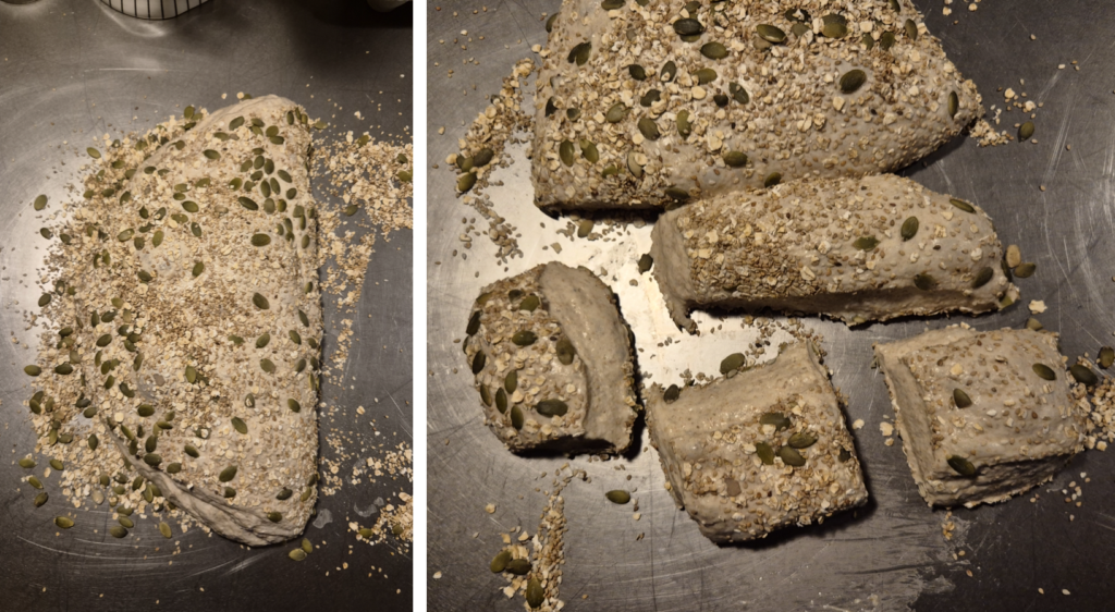 Med en dejskærer (se billeder herunder) vender du forsigtigt den ene halvdel af dejen ind over den anden. Med dejskæreren deler du resolut dejen i to lige store stykker og flytter den ene nogle centimeter væk. Herefter bruger du dejskæreren til at stramme hver dejklump op ved at skubbe dejen ind under sig selv, mens du forsigtigt drejer klumpen rundt om sig selv. Nu har du to flotte, stramme dejklumper (som du også kan smide i ovnen, som de er).